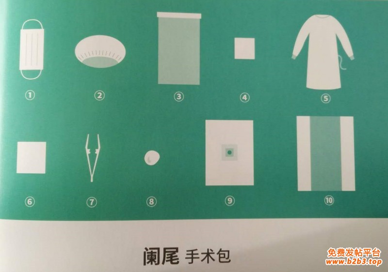 手术包配置:一次性使用医用口罩3个、一次性使用帽3个、器械盘套1条、擦手巾(40*40cm)3块、一次性使用手术衣(加强型)3件、吸水巾6块、镊子1把、医用棉球1包、一次性使用手术洞巾(阑尾手术单)1条、一次性使用包布1条。