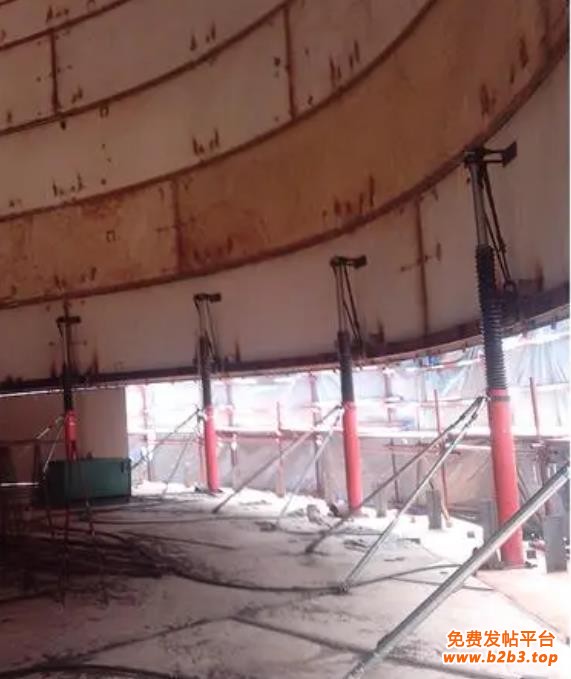 5、注意由于此时刚换完吊点后,钢内筒的提升吊点位于筒体重心下部,筒体处与“头重脚轻”状态,为防止提升时筒体发生晃动或倾斜,所以要有一套的止晃措施。