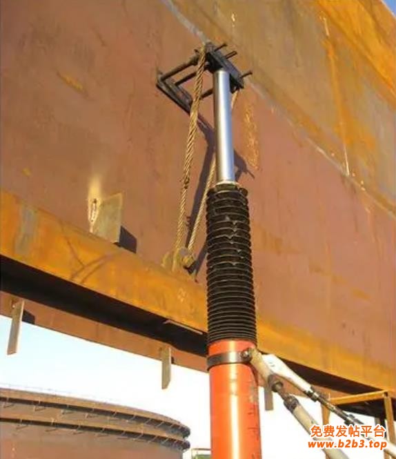 9)当整个气柜柜顶系统上升到指定的安装位置时,可以进行柜顶的安装工作,柜顶安装完哔可将挂钩装置与柜顶脱离,使挂钩装置随同活塞系统整体回落。