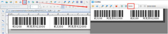 3. 设置完成之后,点击软件顶部的“打印”按钮,在打开的窗口中设置数据量(标签的总个数)为“3000”,开始页码为1,点击结束页码后面的“尾页”,然后点击下面的“预览”按钮,翻页查看批量生成的交叉二五码,预览无误就可以直接连接打印机批量打印出来了。