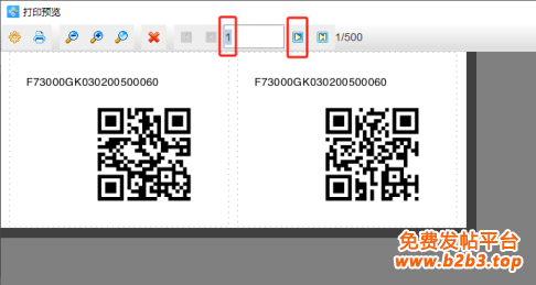 5. 制作完成之后,点击软件顶部的“打印”按钮,在打开的窗口中根据需要设置数据量(这里设置为1000),开始页码为1,点击结束页码后面的“尾页”,然后点击下面的“预览”按钮,翻页查看批量生成的跳号流水号二维码,预览无误就可以直接连接打印机打印出来或者批量输出PDF文档了。
