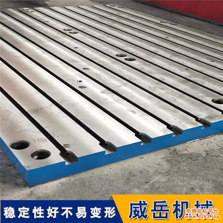 T型槽平台强度铸铁HT200-300工作面硬度为HB170-240,经过两次人工处理(人工退火600度-700度和自然时效2-3年)使用该产品 的精度稳定,耐磨性能好。T型槽平台在机械工厂往往作为平面基准,被修T型槽平台与基准平板进行拖研铲刮,T型槽平台平面度的好坏直接影响产品质量检测的可靠程度。且规格需要大于被修T型槽平台,工厂对检验平板的要求。T型槽平台的铸铁质量和热处理质量对平台使用性能产生较大影响:或因残存较大内应力使工作面变形;或因不耐磨损使精度不能保持;或因刮削困难得不到数值小的粗糙度。因此生产铸铁T型槽平台须注意铸铁材料的选择,采用时效处理等方法除铸铁T型槽平台的残余应力。所以要用正确的保护措施来延长铸铁T型槽平台的使用寿命,使投入与产出比达到一个很好的平衡。