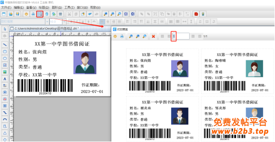 3. 图片借阅证上的照片信息添加完哔后,点击“确定”按钮,就可以看到图片导入的效果了。然后点击软件顶部的“打印预览”按钮,就可以看到Excel表中的图书借阅者信息已经按顺序批量生成标签了,通过左右翻页可以看到图书借阅者不同的标签信息,预览无误就可以连接打印机批量打印出来了。