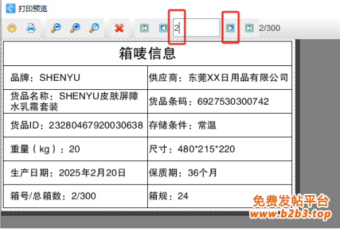 5. 标签制作完成之后,点击软件顶部的“打印”按钮,在打开的窗口中设置数据量(标签的总个数)、开始页码(从那一页开始打印)和结束页码(到那一页结束打印),然后点击下面的“预览”按钮,翻页查看批量生成的箱唛标签,预览无误就可以直接连接打印机打印出来了。