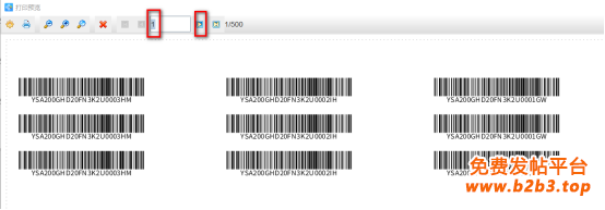 3. 制作完成之后,点击软件顶部的“打印”按钮,在打开的窗口中设置数据量(标签的总个数)为500,开始页码为1,点击结束页码后面的“尾页”,然后点击下面的“预览”按钮,翻页查看批量生成的随机号条码,预览无误就可以输出PDF文档了,输出PDF文档的方法可以参考《条码打印软件如何导入Excel表批量生成SKU码并输出PDF文档》。