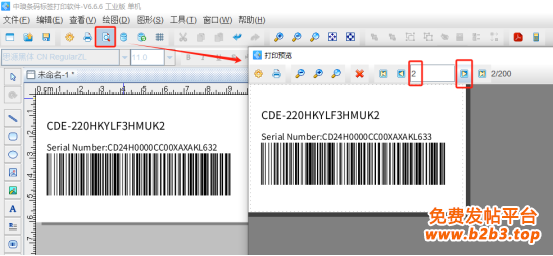 5. 制作完成之后,点击软件顶部工具栏中的“打印预览”按钮,翻页查看批量生成的SN码标签,预览无误就可以直接连接打印机打印机打印出来了。